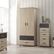 A modern contemporary bedroom set with straight, clean lines. All items are finished in an alpine white oak colour and feature white crocodile design drawers and doors. The wardrobe features internal shelves and a lockable drawer.