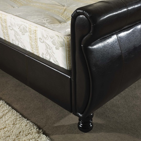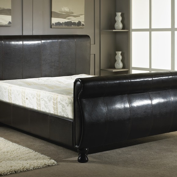 Brown faux leather bed with double wooden sprung slat system and centre support rail.