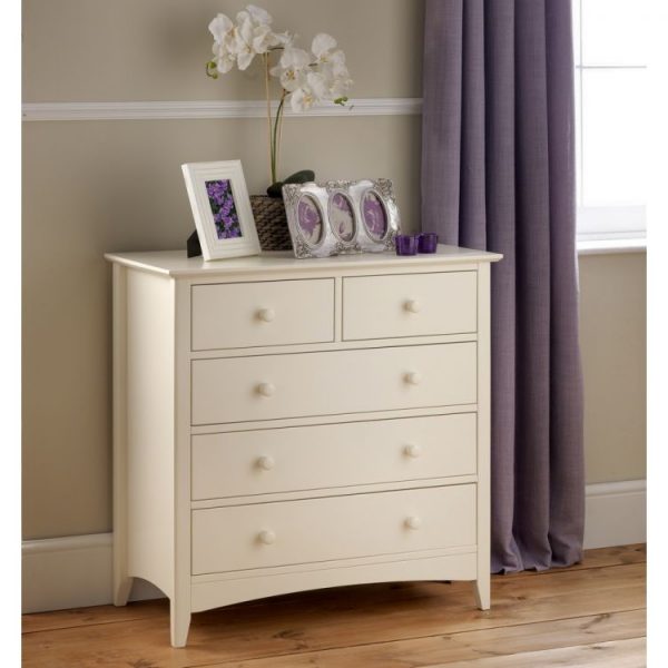 Cameo is a beautiful stone white lacquered bedroom range. Its timeless shaker design is the perfect accompaniment to any interior style and is perfect for grown-up bedrooms and children’s bedrooms alike. Solid pine frames ensure a sturdy and durable construction.The Cameo 3+2 chest offers a great storage solution with 2 small drawers and 3 large drawers.