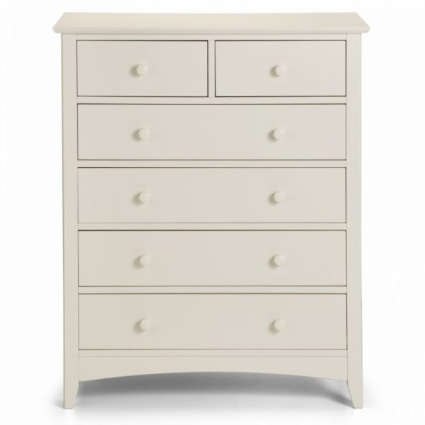 Cameo is a beautiful stone white lacquered bedroom range. Its timeless shaker design is the perfect accompaniment to any interior style and is perfect for grown-up bedrooms and children’s bedrooms alike. Solid pine frames ensure a sturdy and durable construction.The Cameo 4+2 chest offers a great storage solution with 2 small drawers and 4 large drawers.