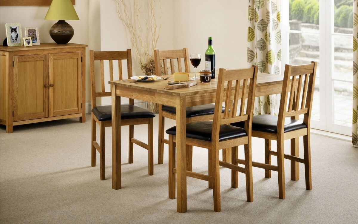 SolidĀ Oak Dining TableĀ in a Rich Oiled Finish and featuring a matching Solid Oak Dining Chair with padded Brown Faux Leather Seat.