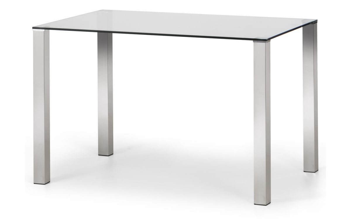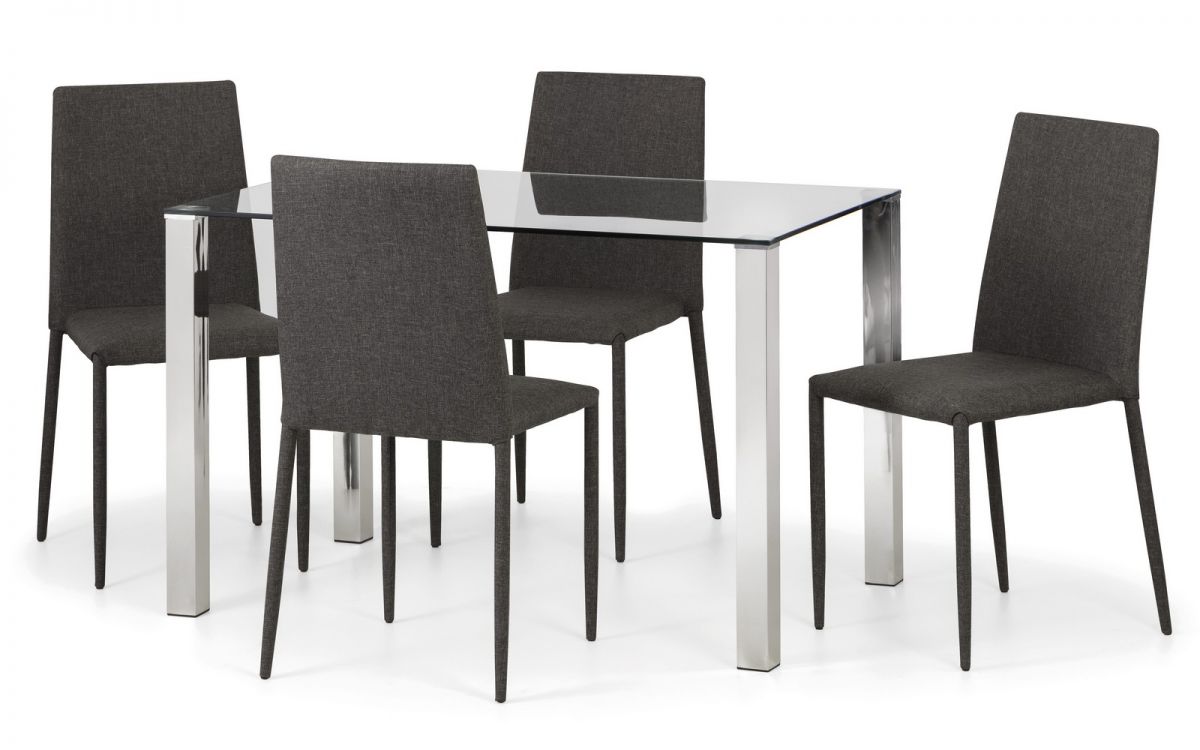 The Enzo is a contemporary and compact chrome and tempered glass dining table that is perfect for modern living. The clean and crisp finish forms a versatile look that fits with a variety of different dining chair styles. Accompanied by the stylish upholstered Jazz Dining Chairs in Slate Grey Linen