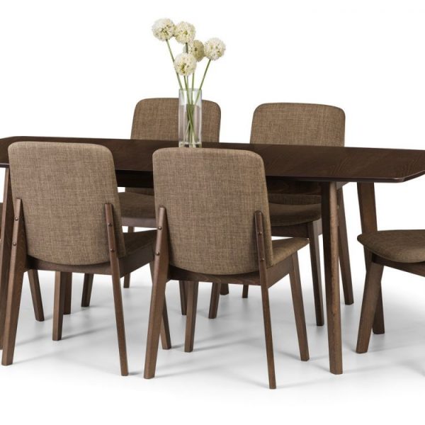 A truly stunning walnut finish dining table crafted from solid beech and beech veneers. Its sleek, modish design adds a real wow factor to any dining room, while an easy to use extending leaf means that it also offers exceptional practicality. Paired with the Kensington chairs in Cappuccino Linen effect fabric that are ergonomically formed and padded for a very comfortable sit.