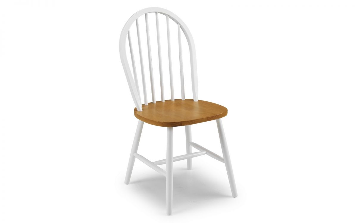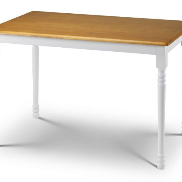 A Simple Farmhouse Style Dining Set with a White Lacquered Base and Oak Coloured Solid Wood Top.
