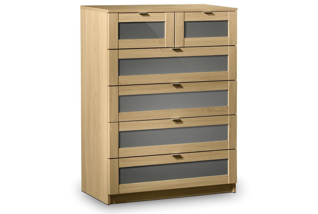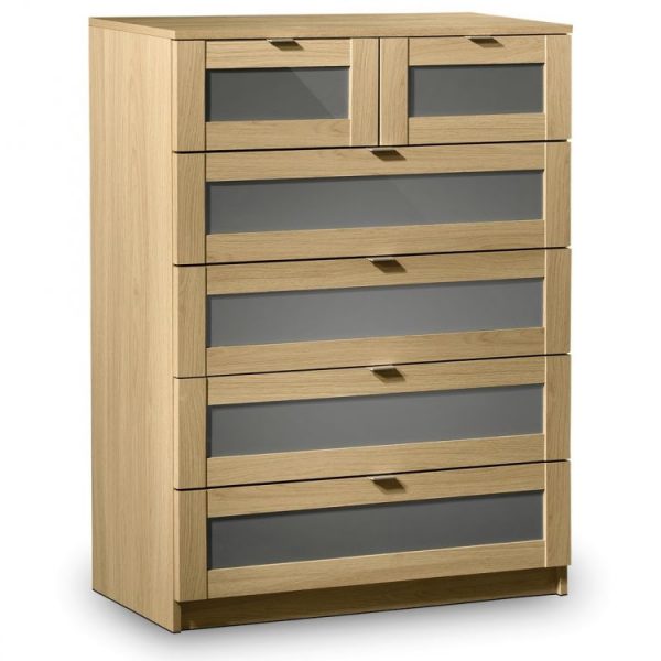 Strada is a chic, contemporary bedroom collection which combines a stylish light oak finish with attractive smoked high gloss inserts to stunning effect. Strada complements most bedframe styles from metal and wood to fabric for a softer look. Outstanding value for money.