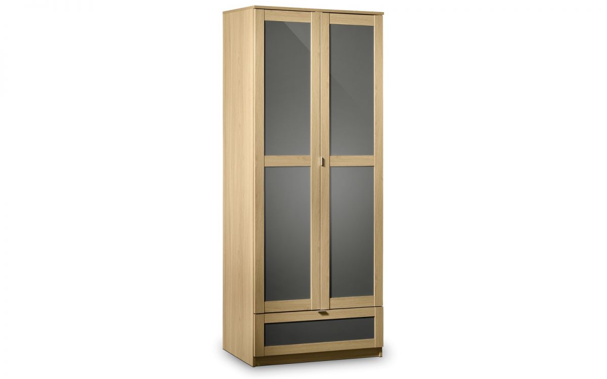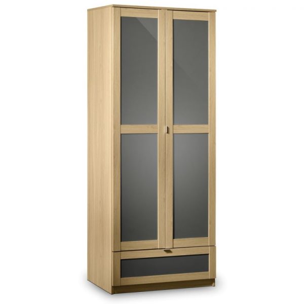 Strada is a chic, contemporary bedroom collection which combines a stylish light oak finish with attractive smoked high gloss inserts to stunning effect. Strada complements most bedframe styles from metal and wood to fabric for a softer look. Outstanding value for money.The Strada combination wardrobe has copious hanging space, a large storage drawer and a handy internal shelf