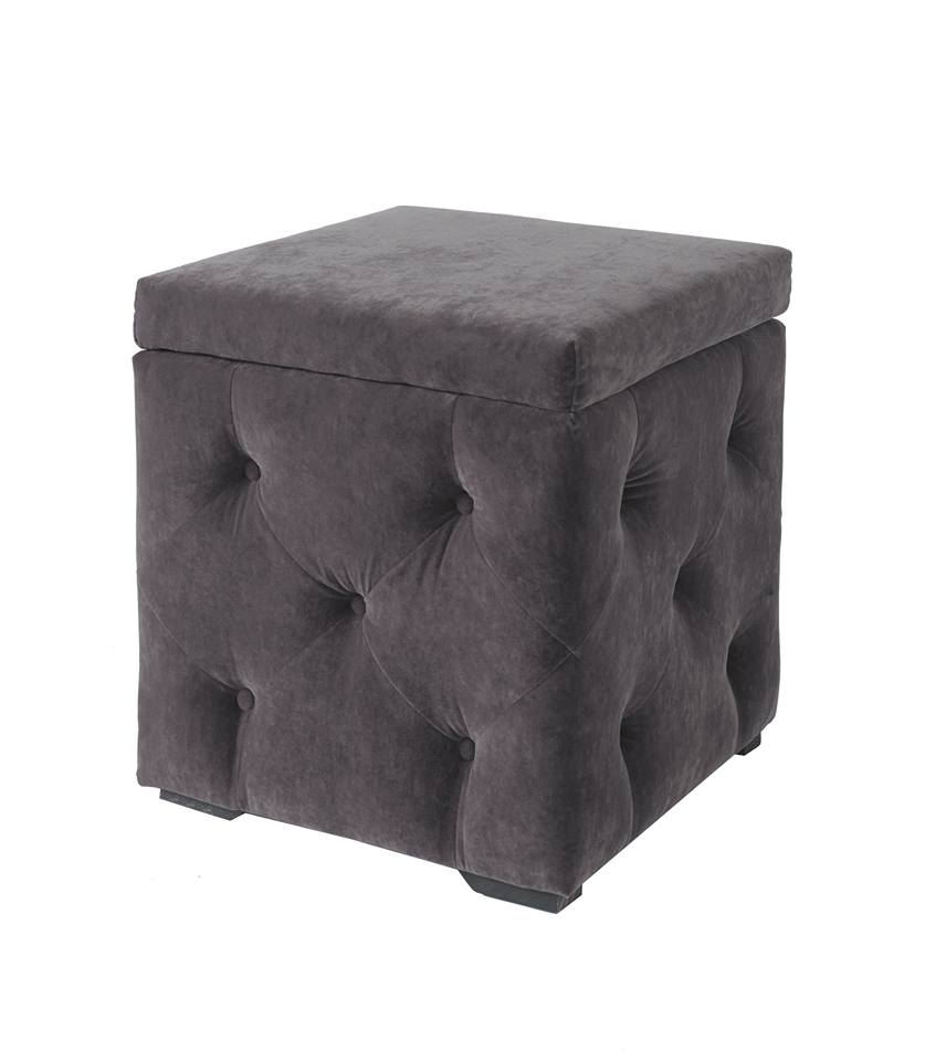Plush, buttoned square storage stool available in either charcoal or beige velvet style fabric.
