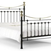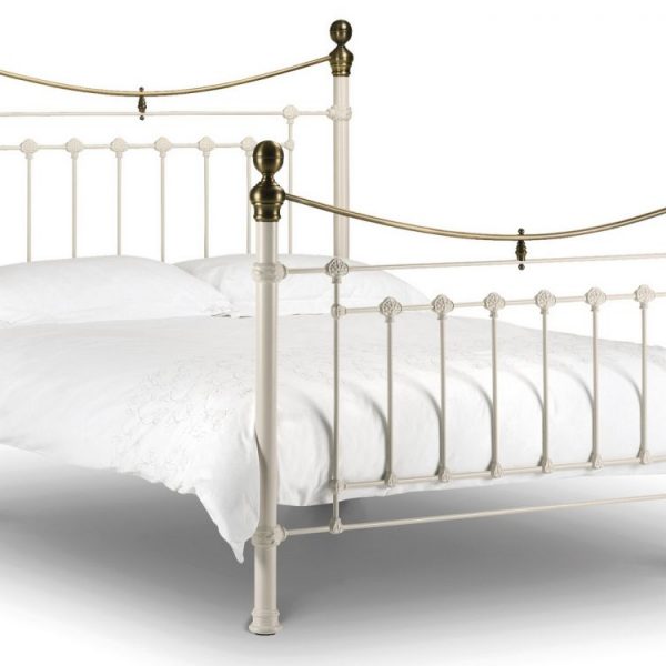 A traditional, victorian inspired bedstead with brass embellishments in a stone white finish.
